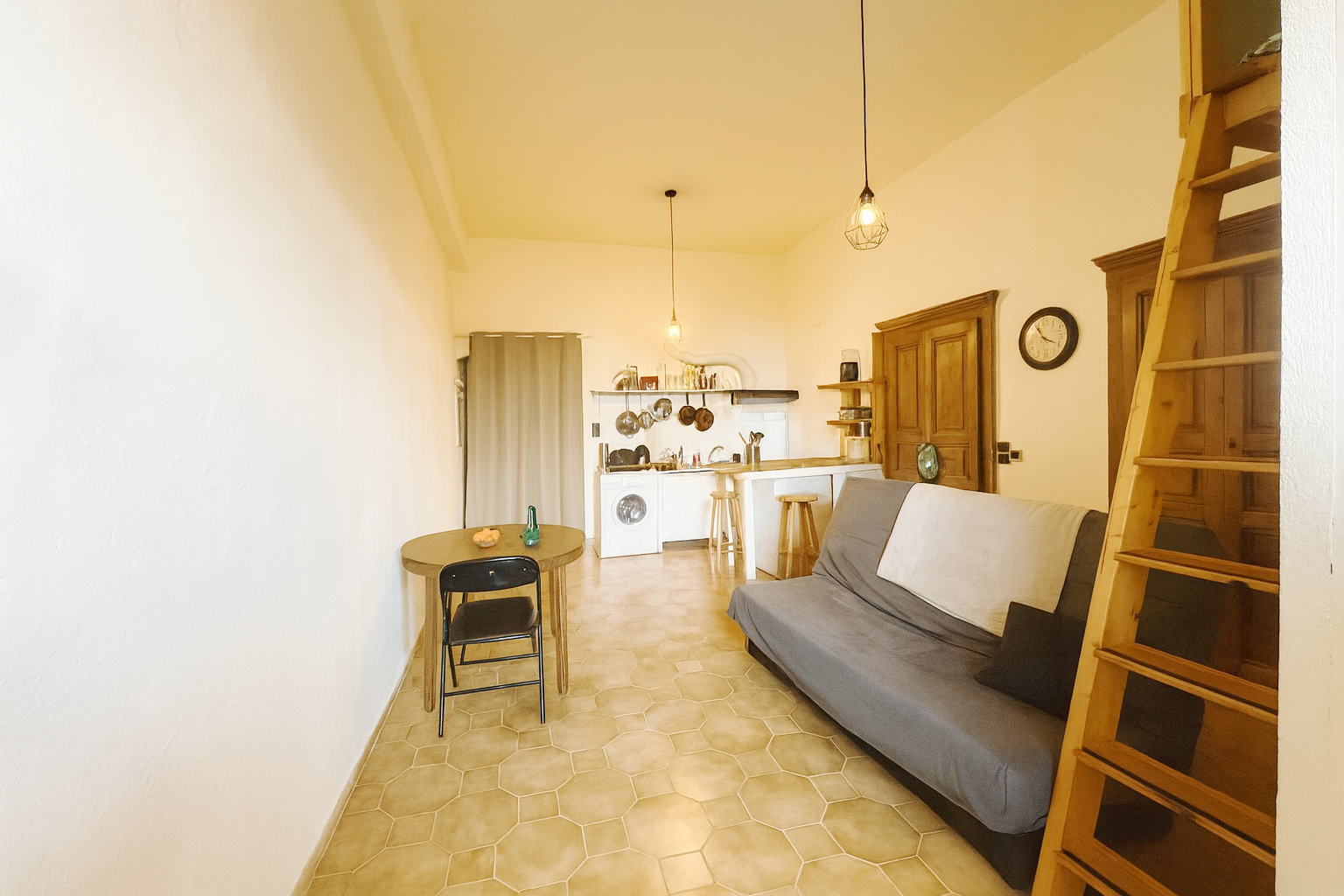 Un studio comprenant un coin cuisine, un séjour/chambre, une salle de bains/wc et une mezzanine