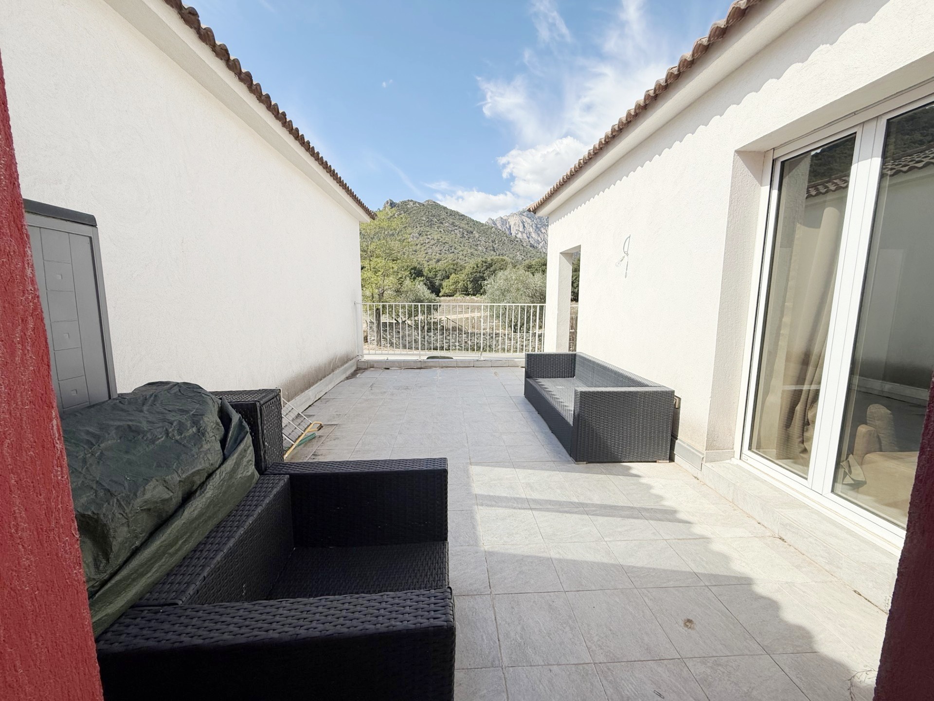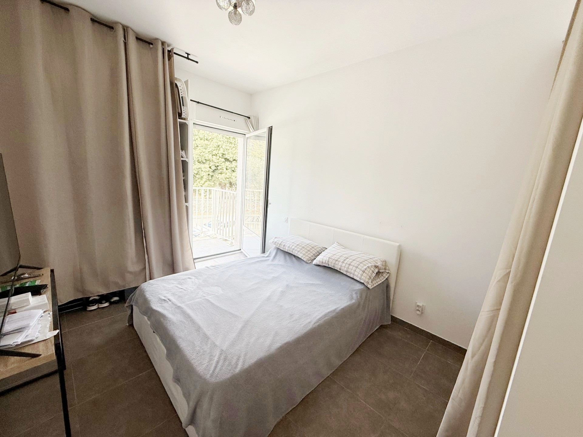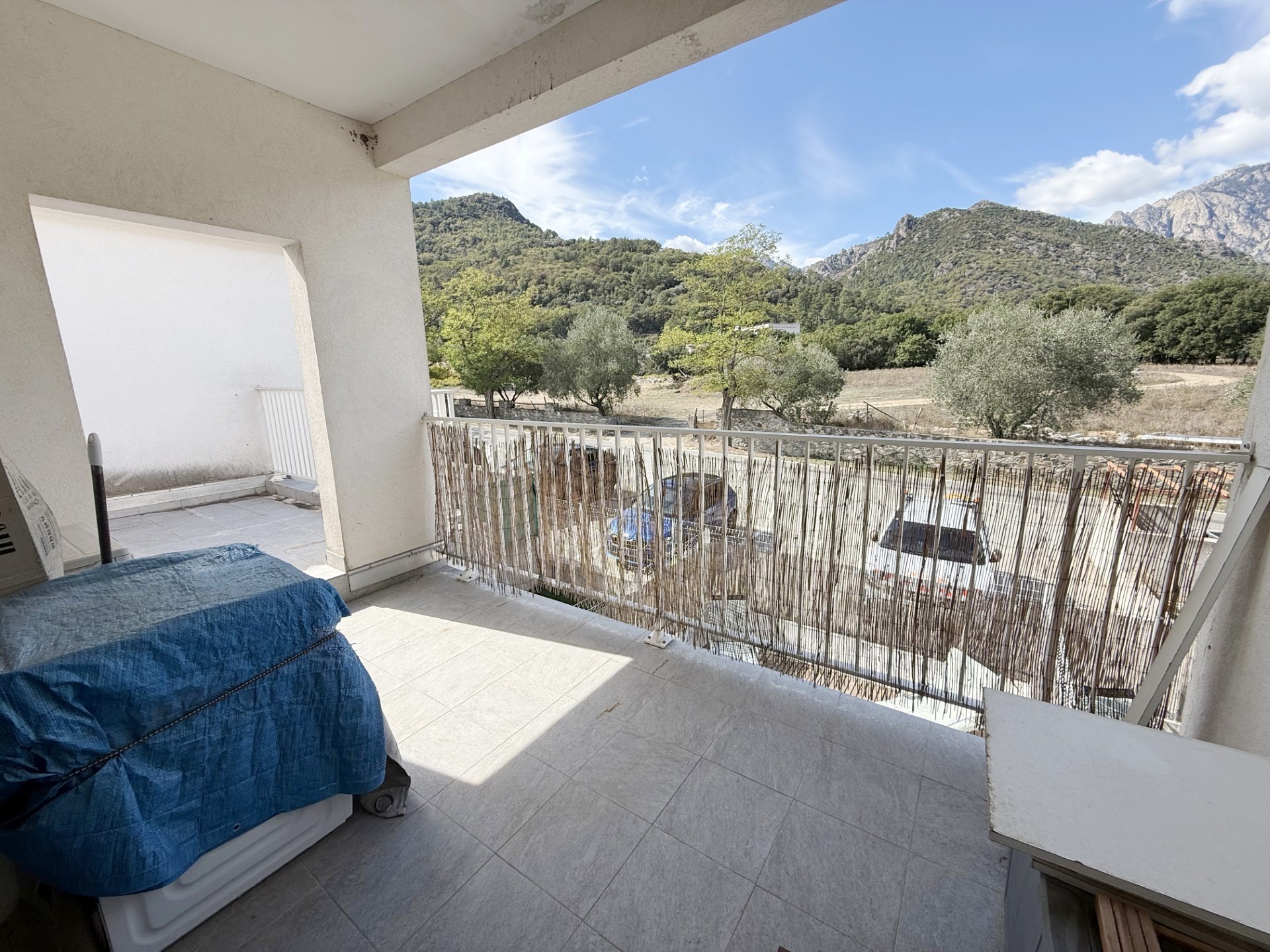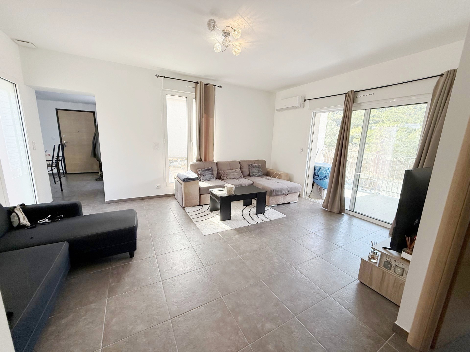 Un appartement de type T2 comprenant un grand séjour, une cuisine équipée, une chambre, une salle de bains, un wc séparé, une grande terrasse, une terrasse couverte et un balcon