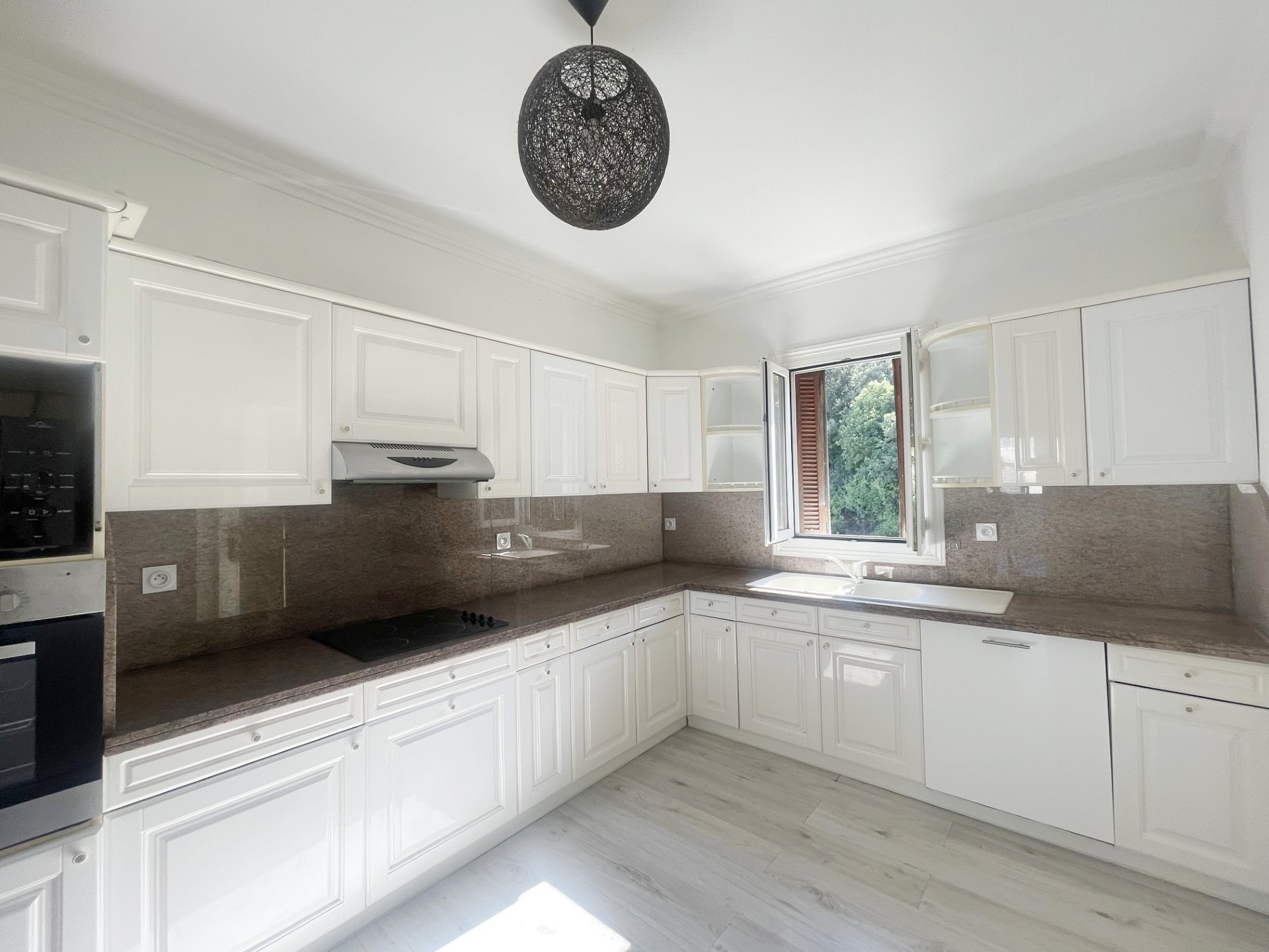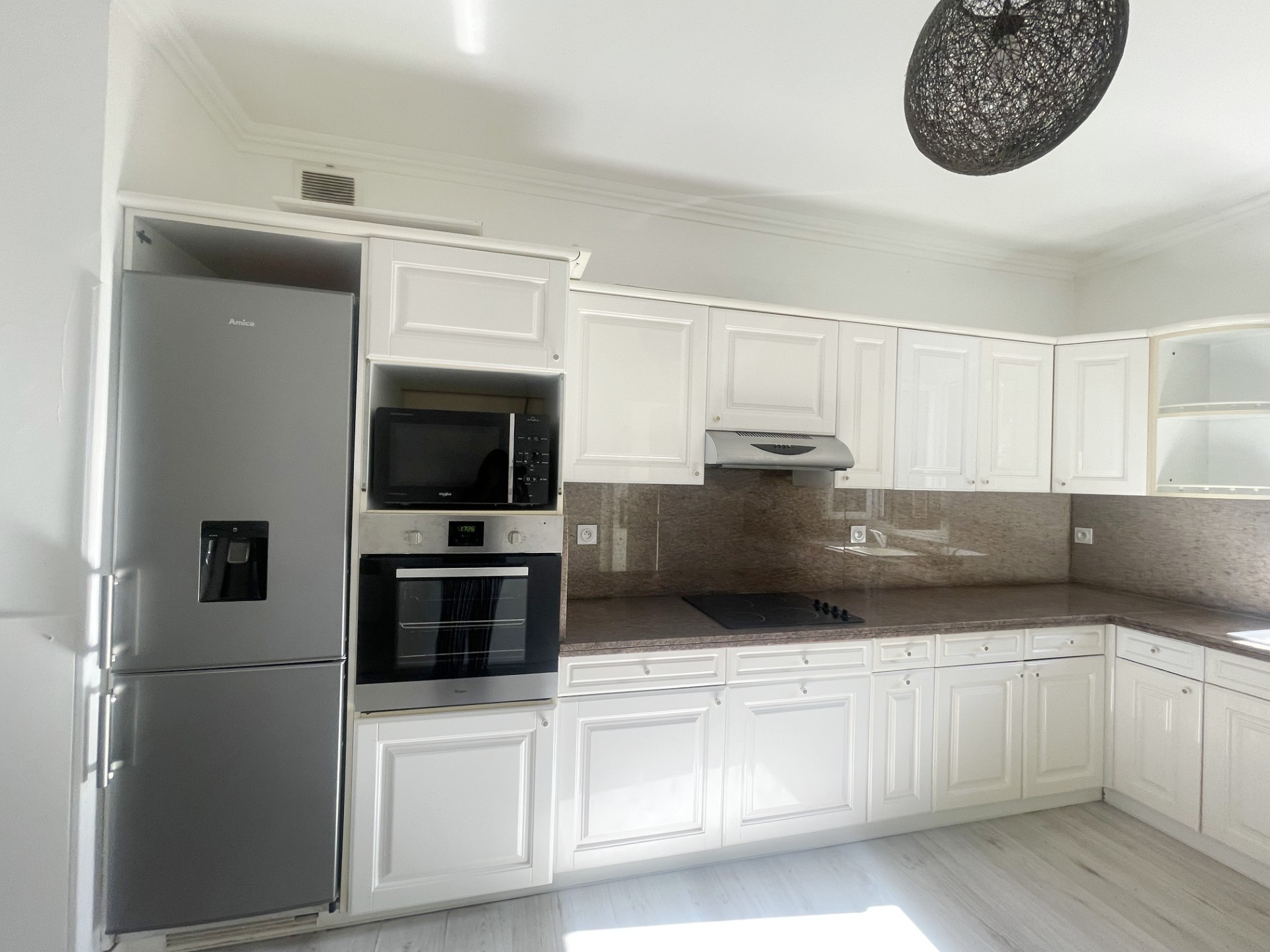 Cuisine entièrement équipée (placards hauts et bas, plan de travail, évier, hotte, réfrigérateur, four, micro-onde, lave-vaisselle)