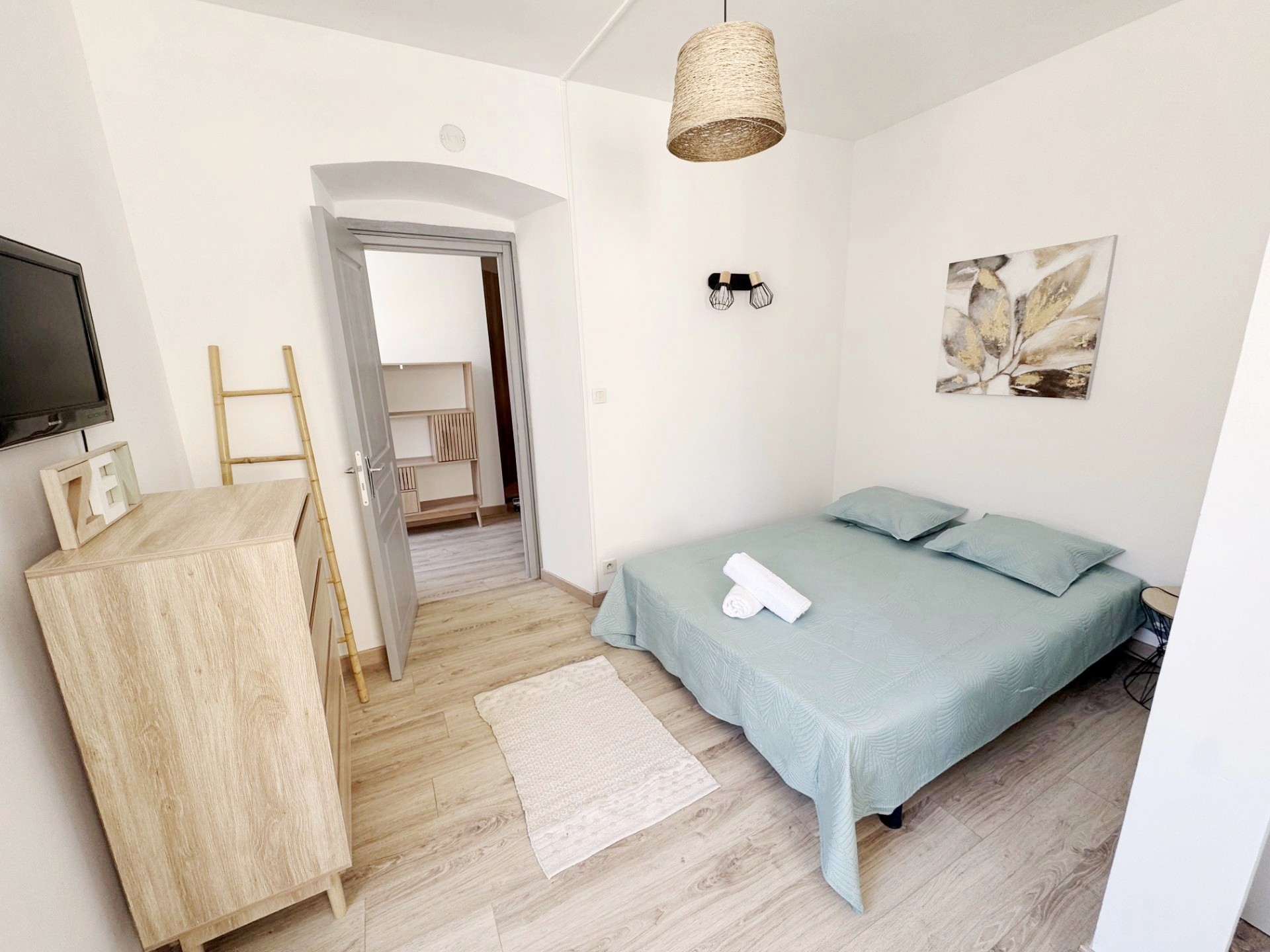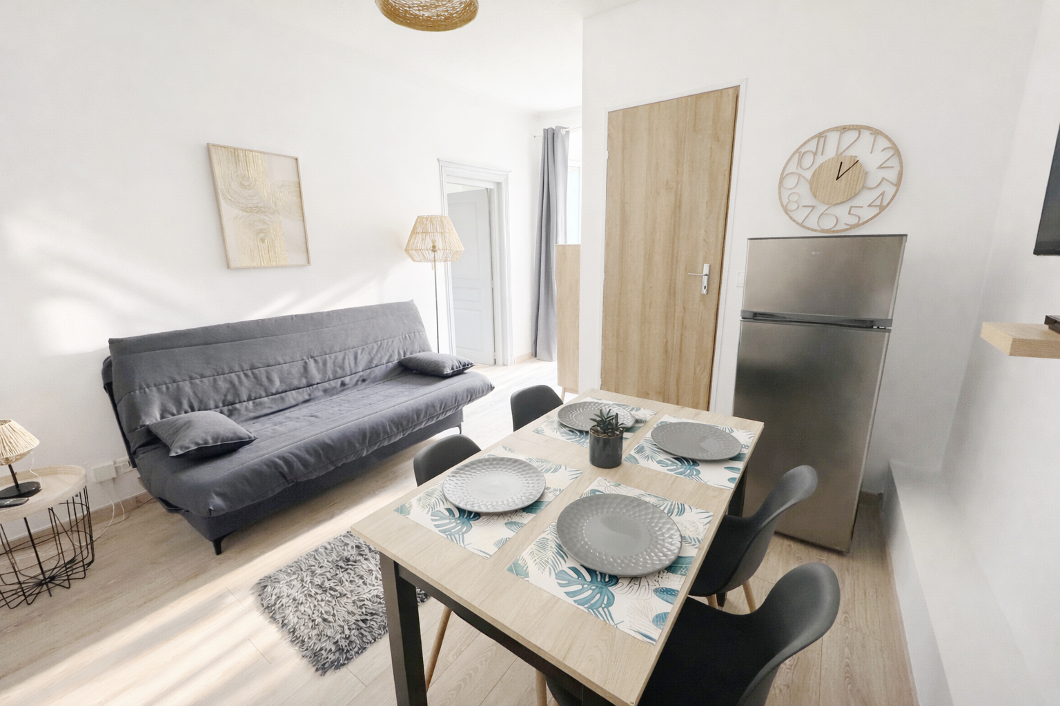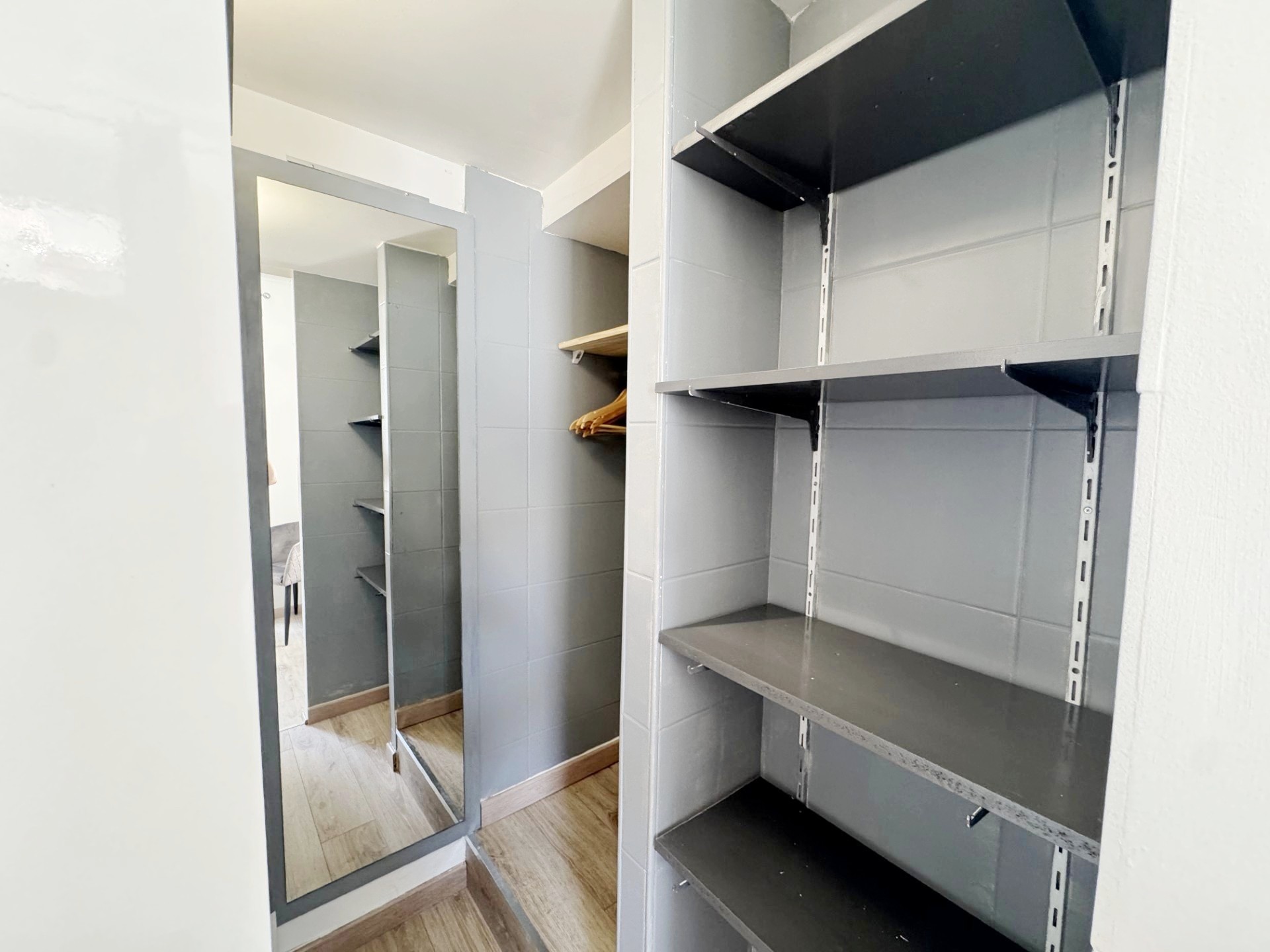 Un appartement de type T2 comprenant un séjour ouvert sur cuisine équipée, une chambre, une salle de bains/wc et un dressing