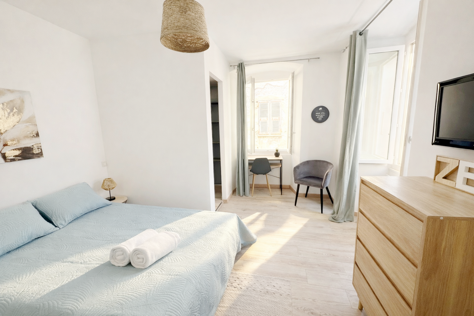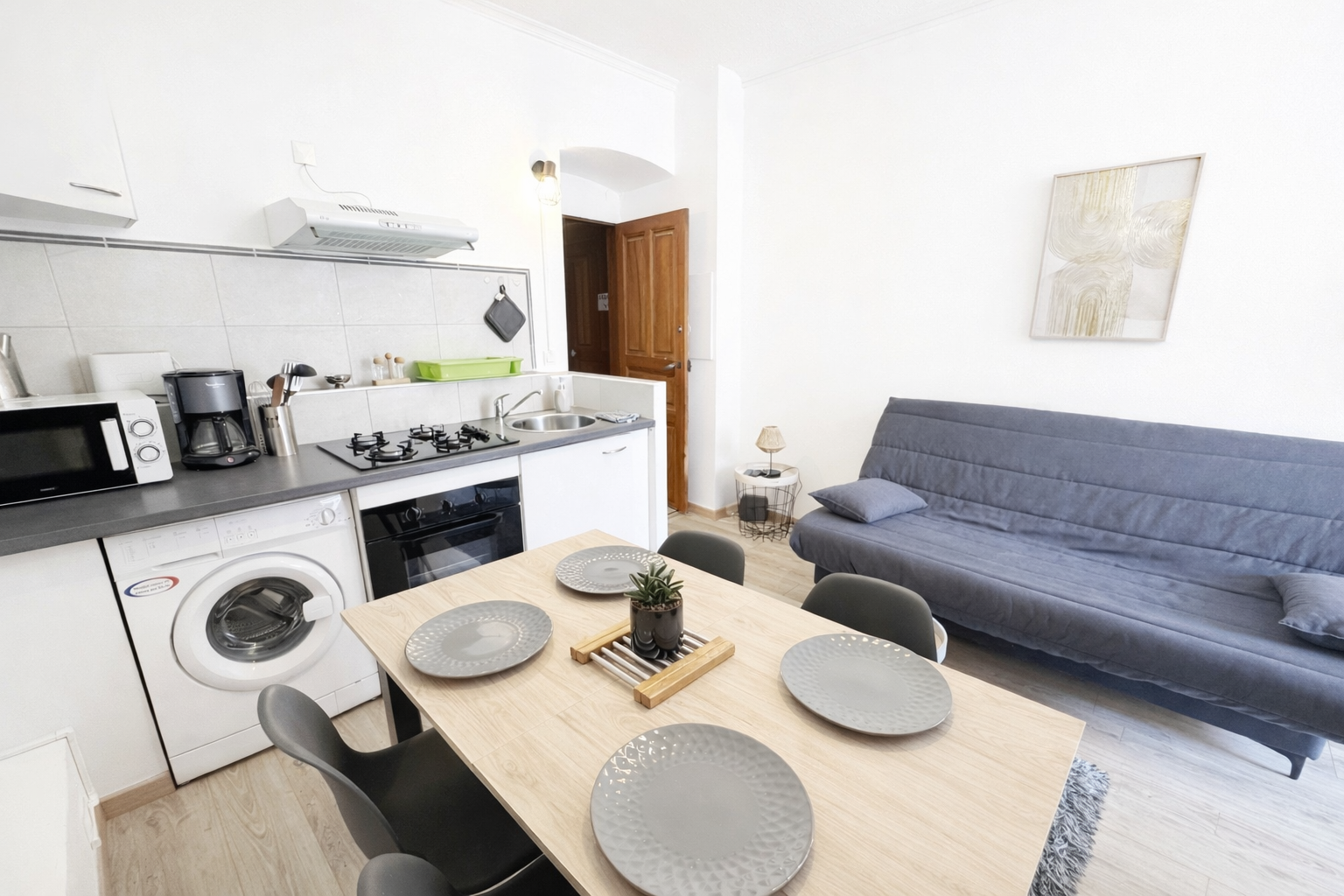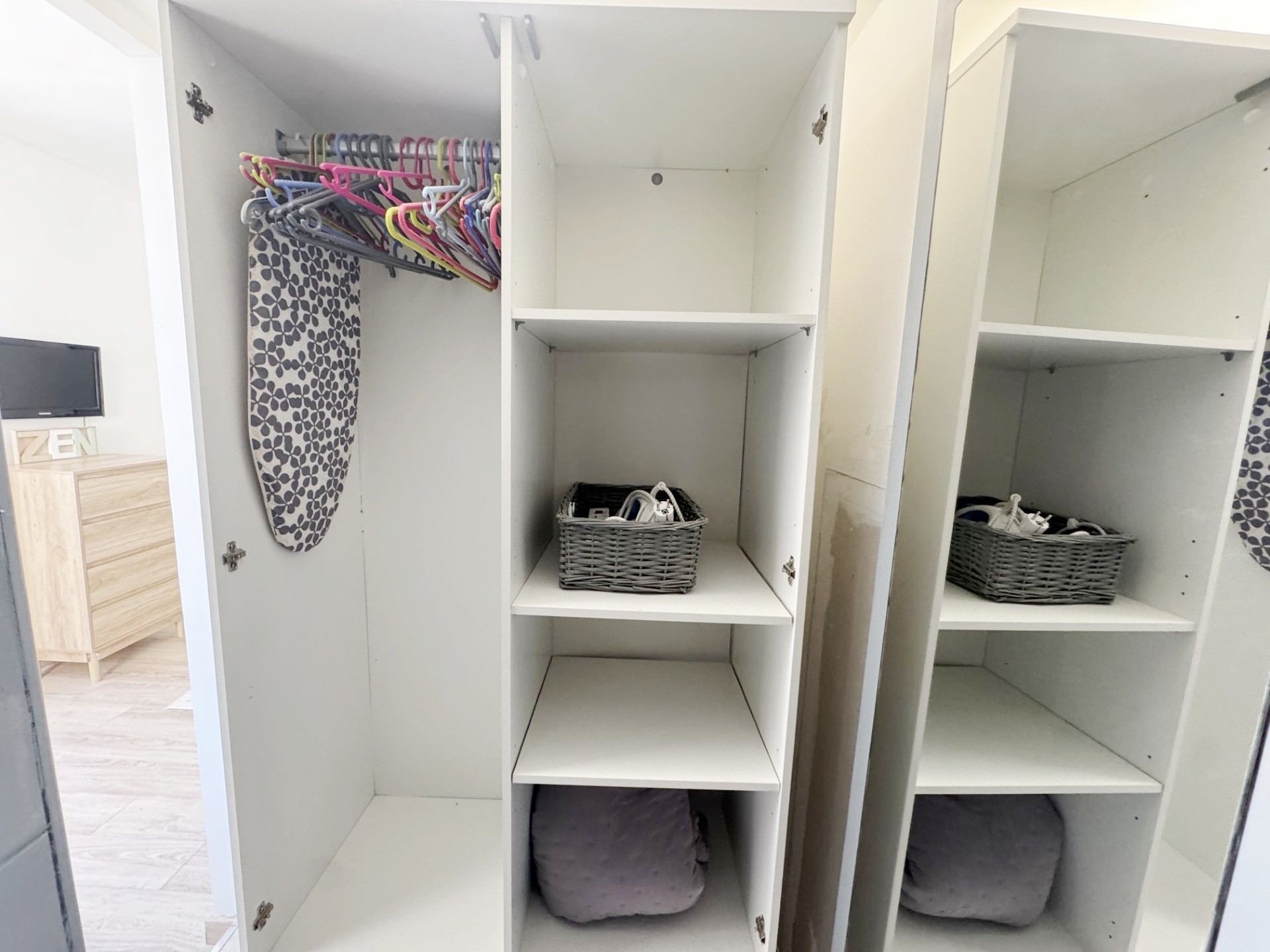 Un appartement de type T2 comprenant un séjour ouvert sur cuisine équipée, une chambre, une salle de bains/wc et un dressing