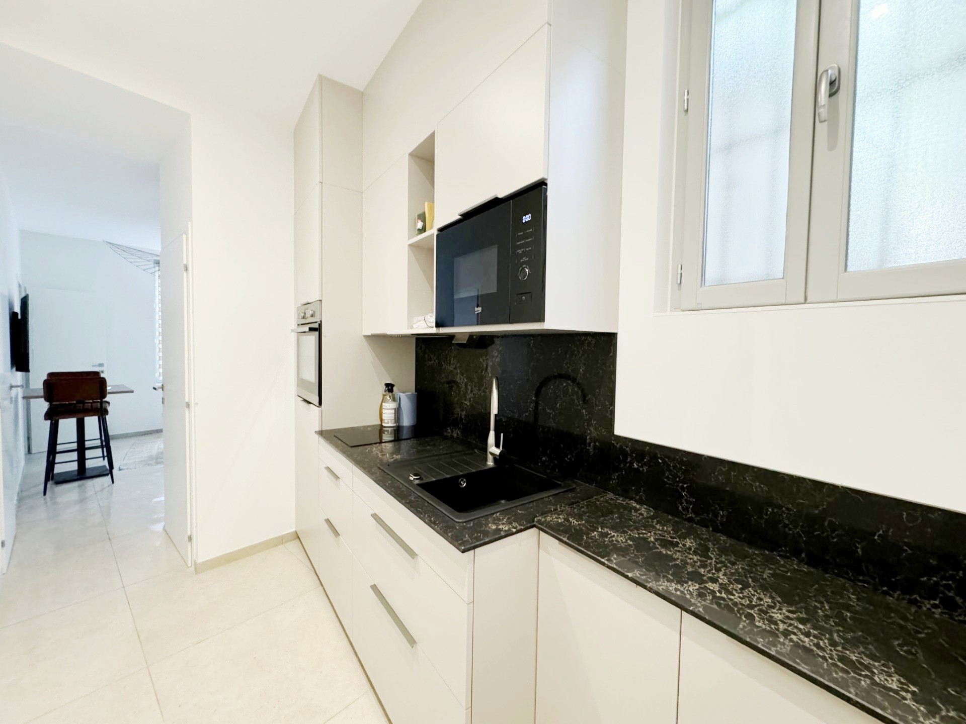Un appartement de type T2 entièrement refait à neuf comprenant un séjour, une cuisine équipée, une chambre, une salle de bains, un wc séparé et un espace buanderie