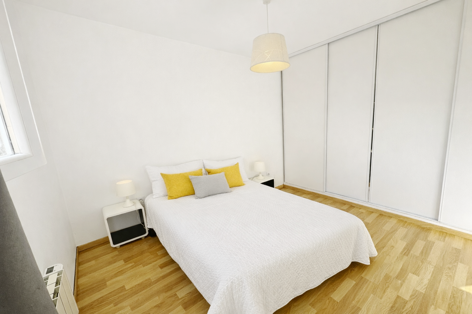 Meublé : canapé, lit, table haute, grand dressing, plaque de cuisson, réfrigérateur…