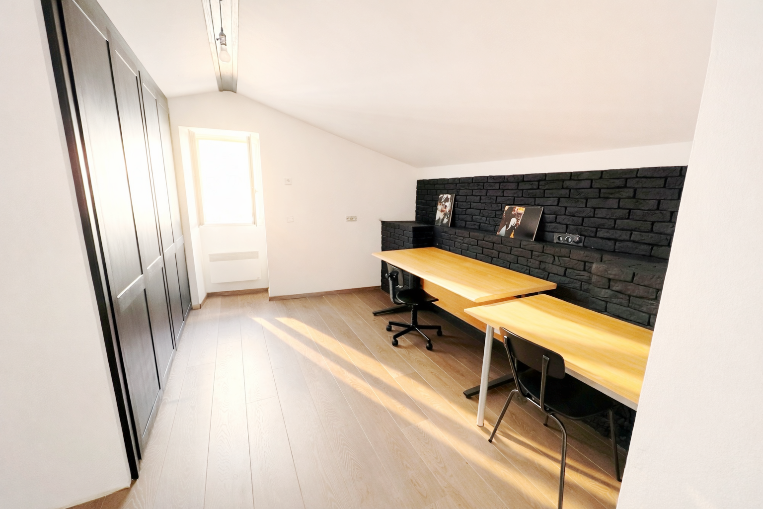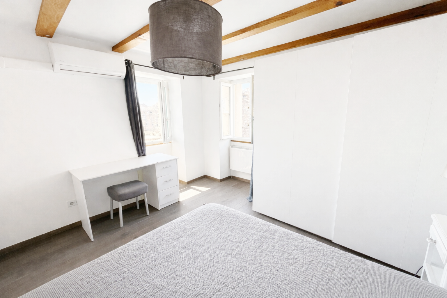 Entièrement meublé et équipé : canapé, lits, bureaux, réfrigérateur/congélateur, four, micro-onde, lave-vaisselle, machine à laver, TV…