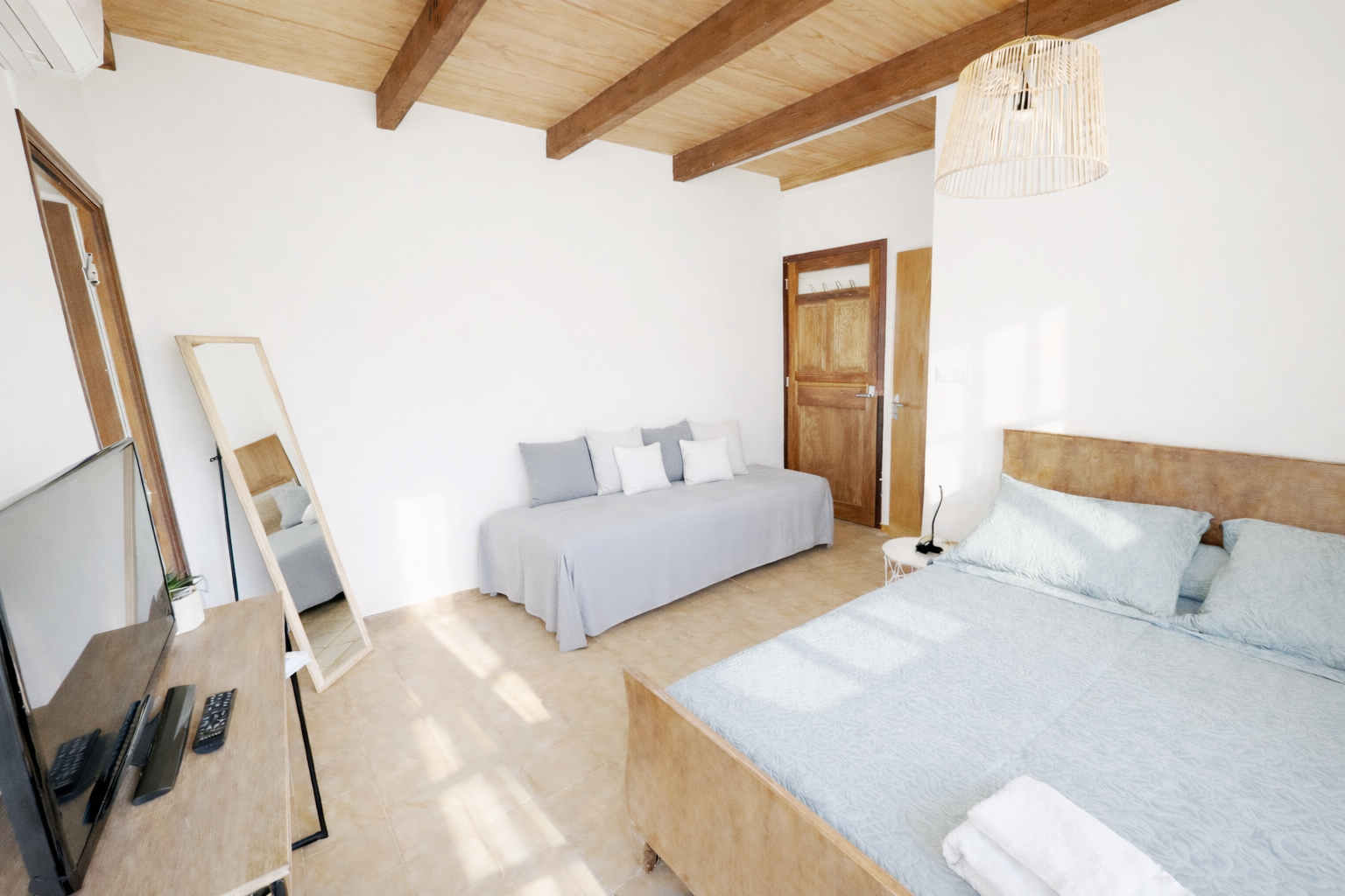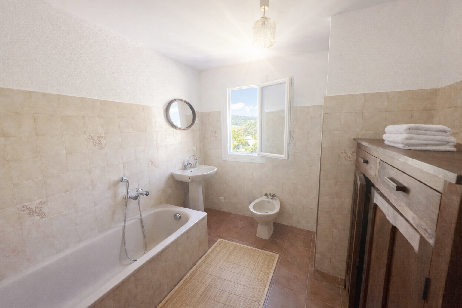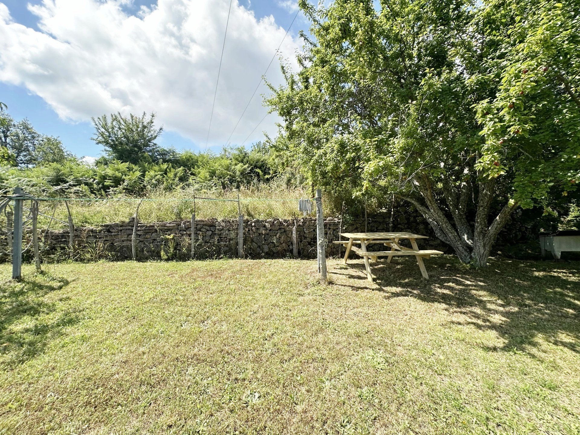 Entièrement meublé et équipé : lit, placard de rangement, tables et chaises d’intérieur et d’extérieur, réfrigérateur/ congélateur, four, micro-onde, machine à laver, TV …