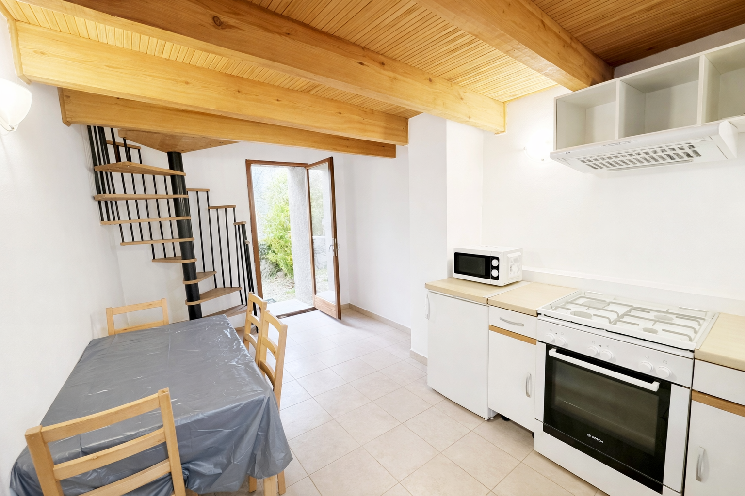 Un appartement de type T1 en duplex comprenant un séjour ouvert sur cuisine équipée, une chambre, une salle de bains/wc et un petit espace extérieur