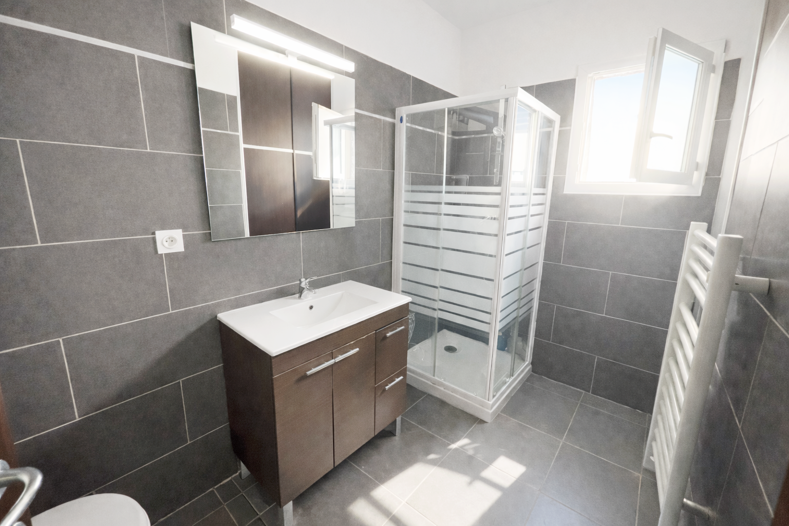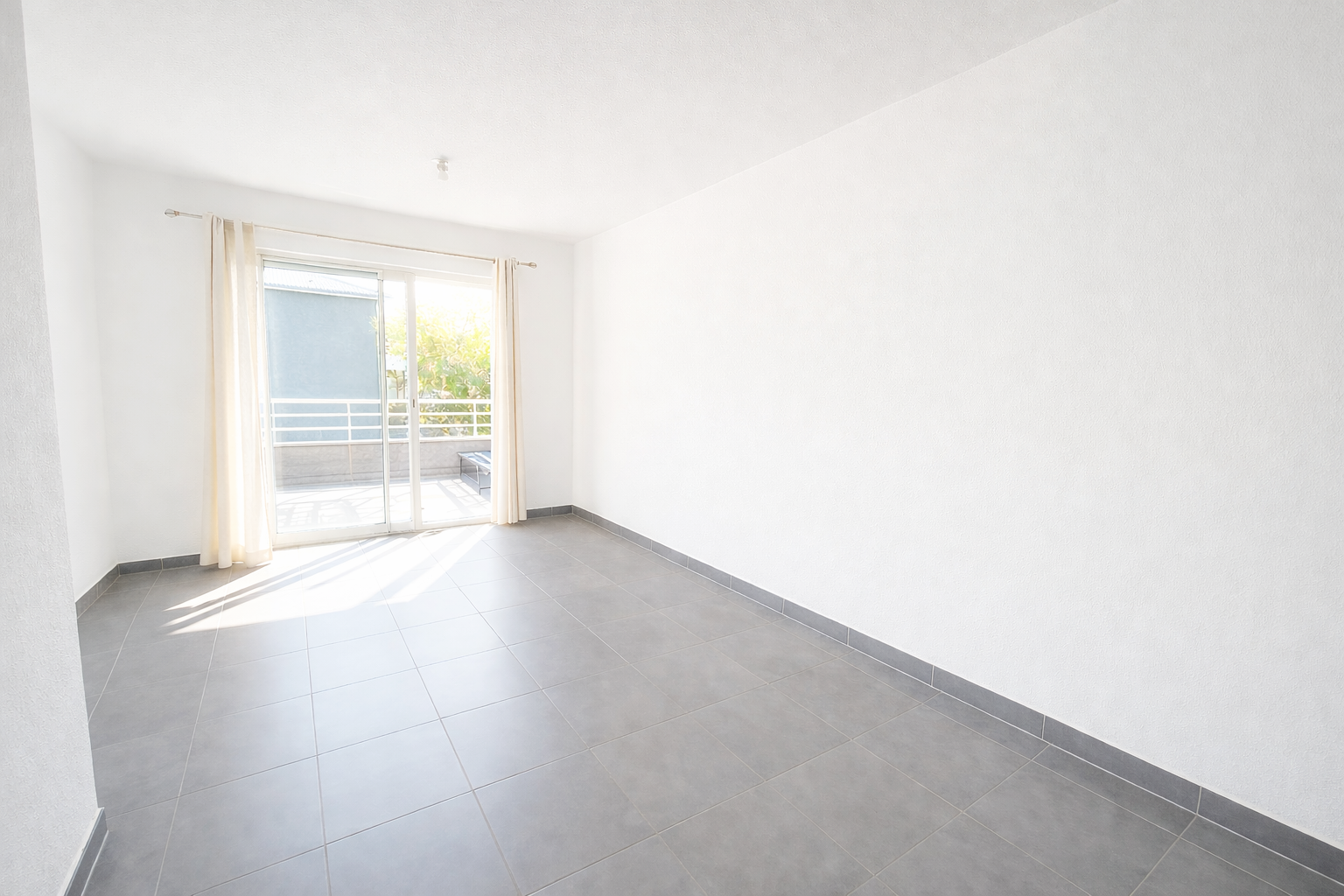 Un appartement de type T2 comprenant un séjour ouvert sur cuisine, une chambre, une salle de bains/wc et une grande terrasse