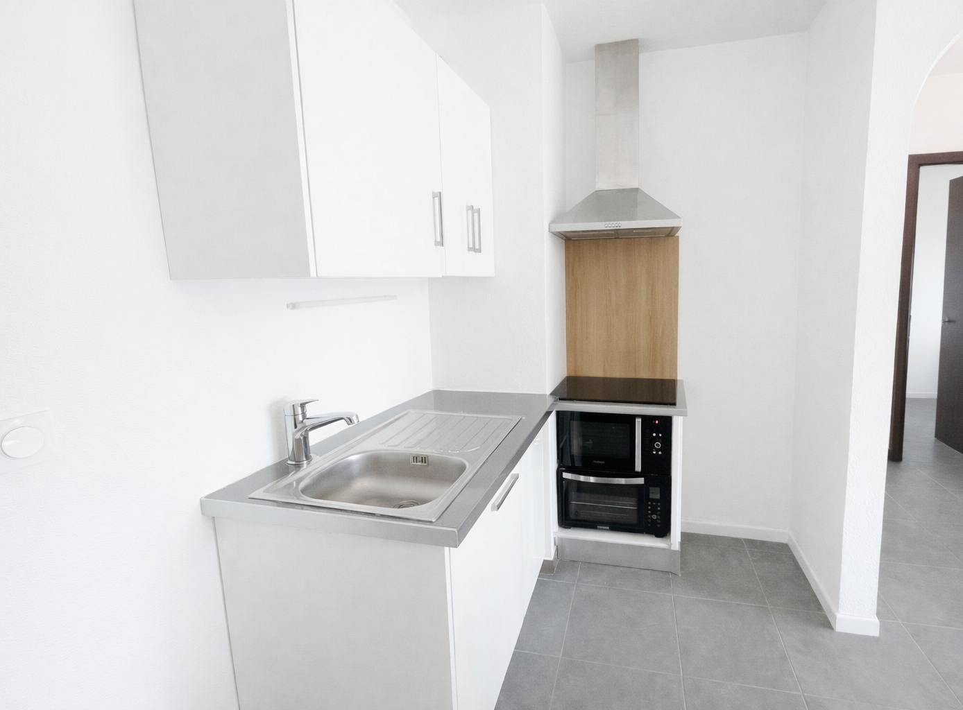 Cuisine avec plan de travail, évier, plaques de cuisson, hotte aspirante et placards