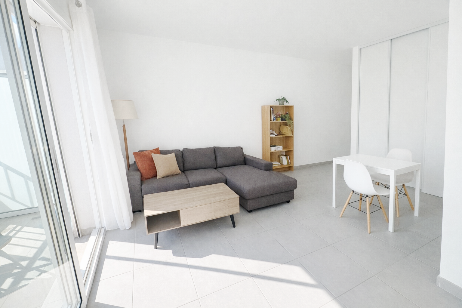 Un appartement de type T2 comprenant une entrée, un séjour ouvert sur cuisine, une chambre, une salle de bains/wc et une terrasse
