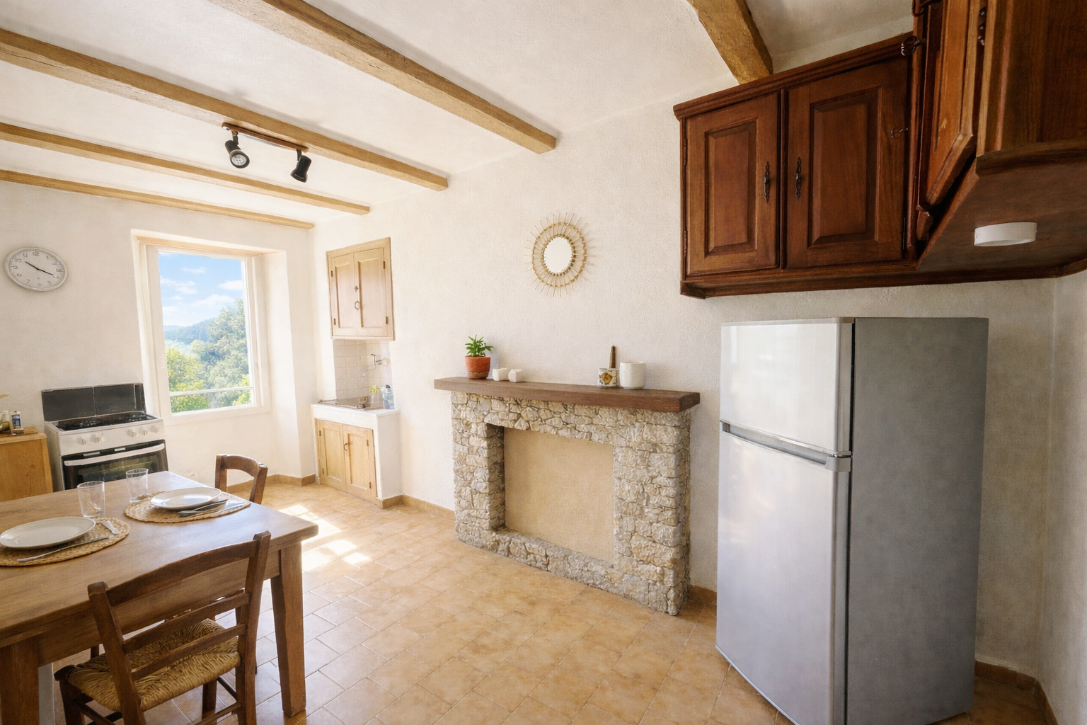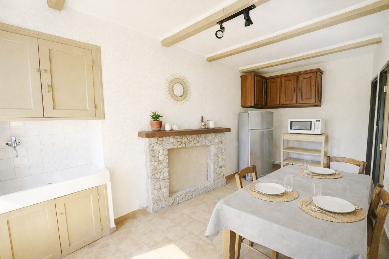 .une cuisine avec table et chaises pour 4 personnes, plaques de cuisson, four, micro-onde, réfrigérateur/congélateur, cafetière…