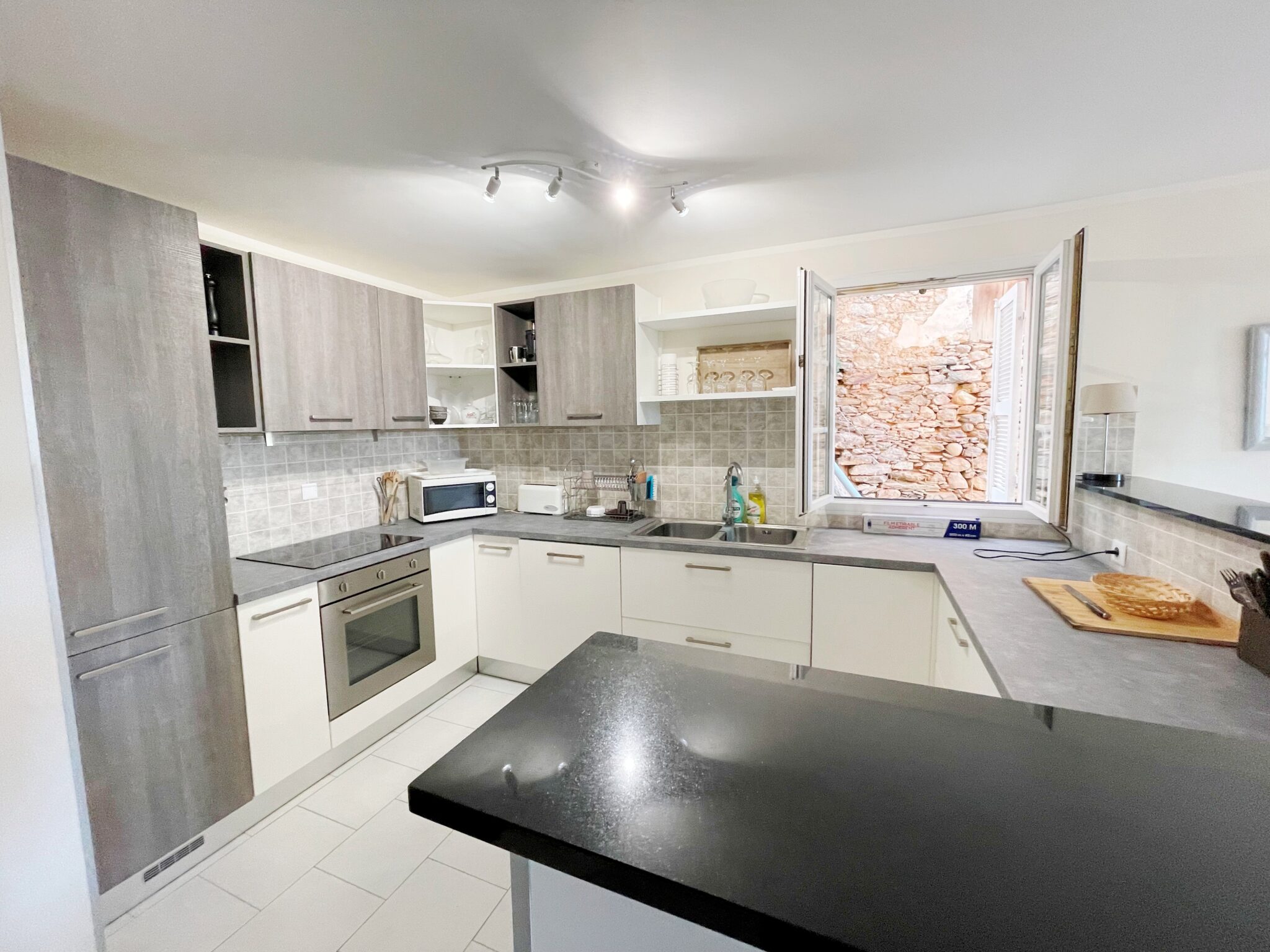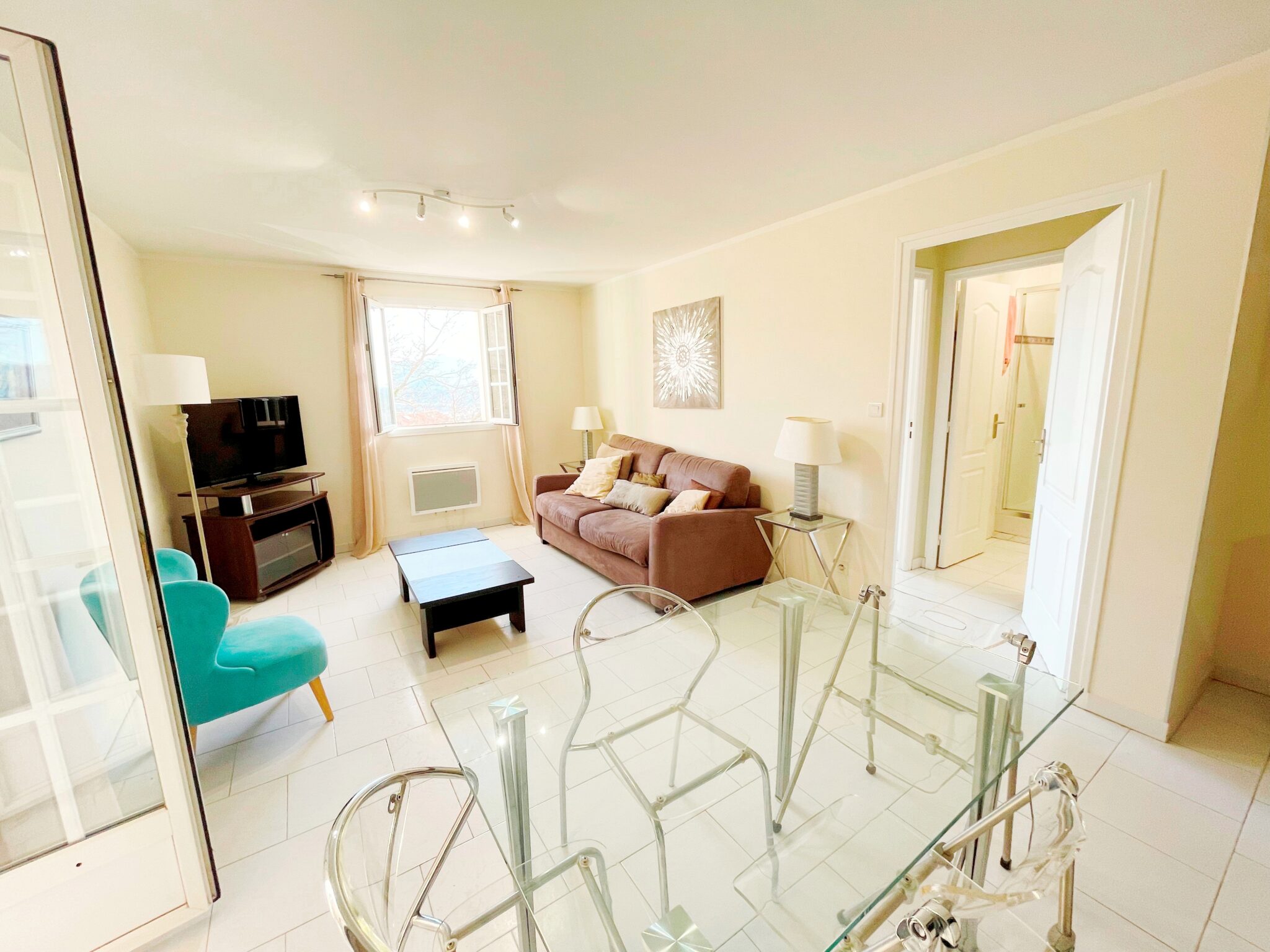 Ce joli appartement de 50 m² entièrement refait à neuf et joliment décoré comprend un entrée (avec grande penderie), un vaste séjour lumineux (avec canapé convertible, fauteuil, table et chaises, TV…), ouvert sur cuisine équipée (avec plan de travail, comptoir, réfrigérateur/congélateur, four, micro-onde, lave-vaisselle …), une chambre (avec lit 2 places, grande penderie, commode, tables et lampes de chevet …), une salle de bains/wc (avec douche) et une buanderie (avec machine à laver, table et fer à repasser, étendoir, vélo d’appartement…)