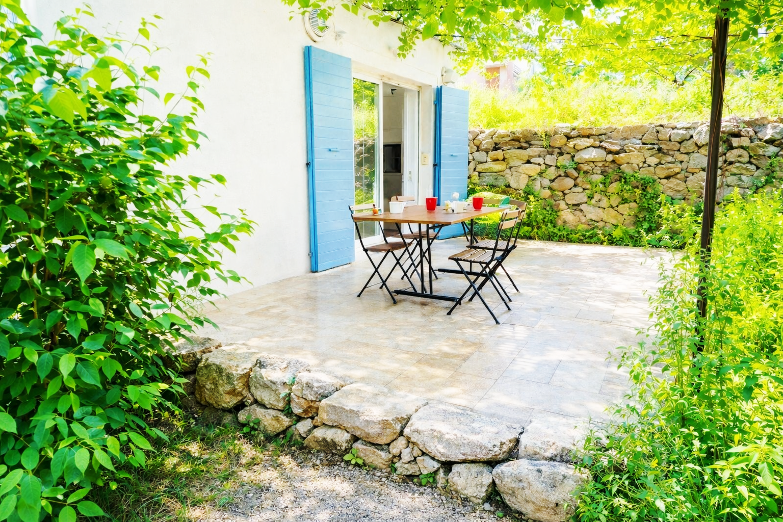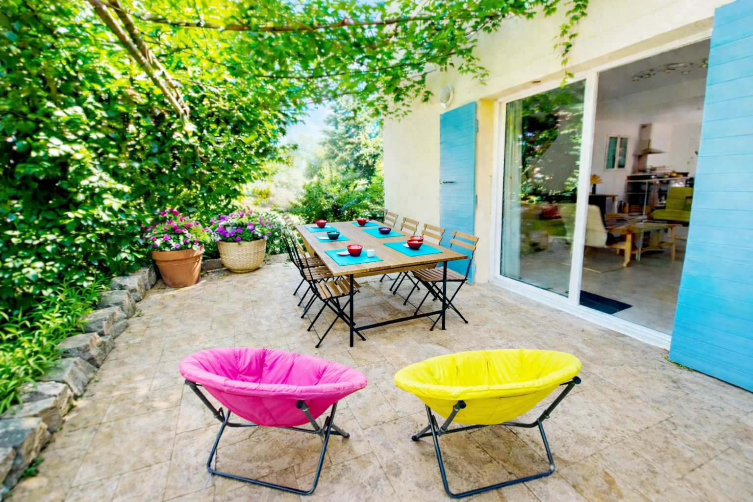. Une grande terrasse (table et chaises d’extérieur, étendoir)