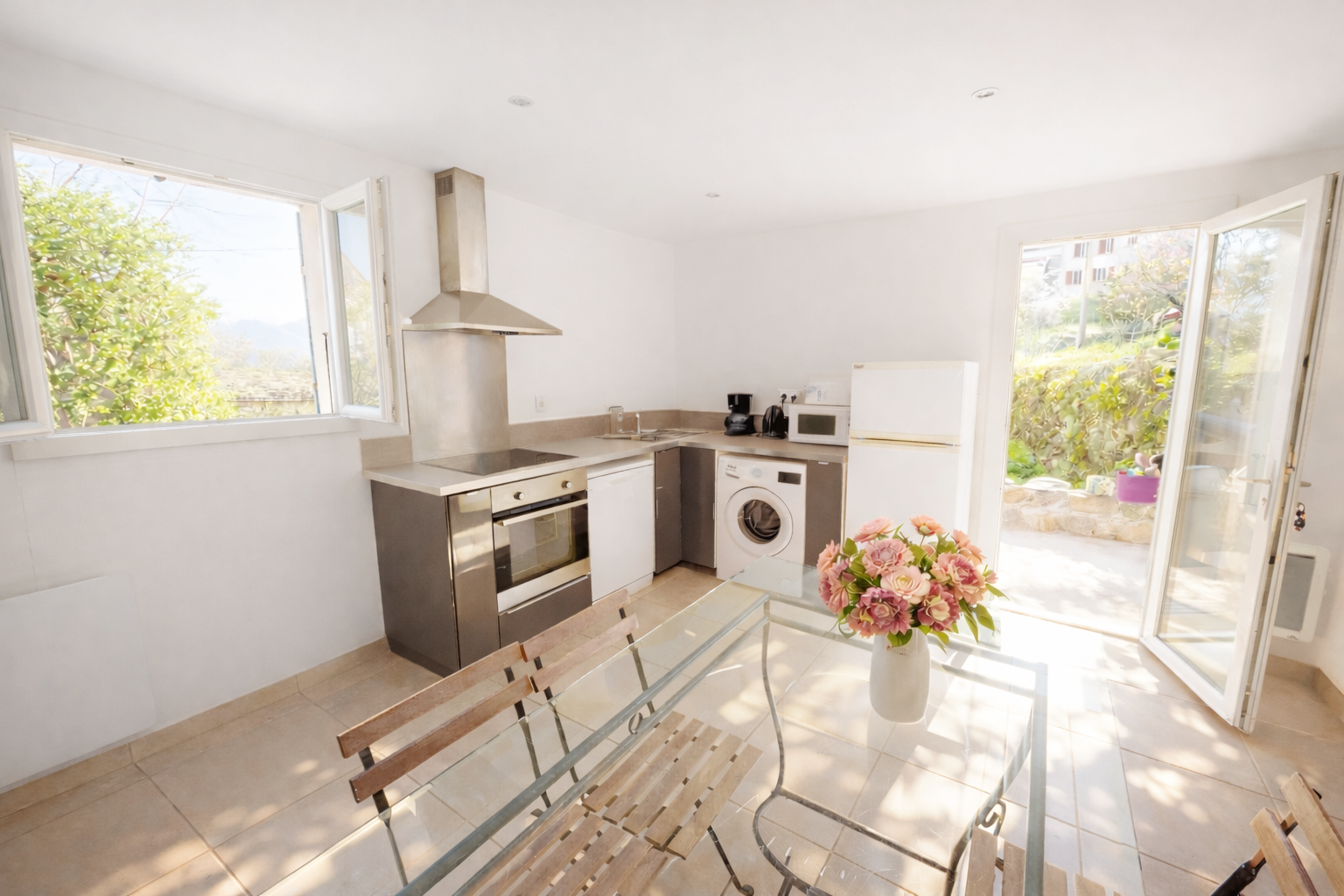 . Cuisine équipée (plan de travail, plaques de cuisson, réfrigérateur/congélateur, four, micro-onde, lave-vaisselle, lave-linge…
