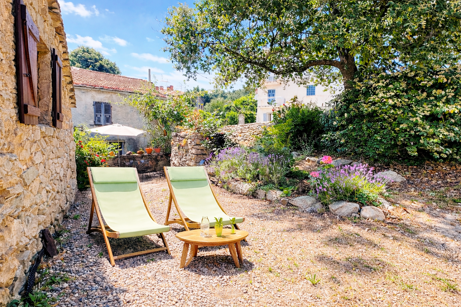 . Un espace extérieur relativement arboré avec table et chaises d’extérieur, parasol, transats et barbecue.