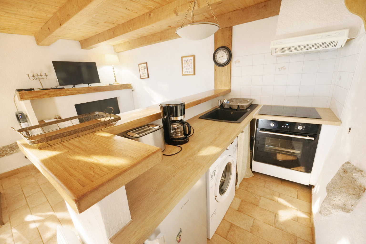 . au rez-de-chaussée : un séjour (cheminée, canapé convertible, table et chaises, buffet, TV) ouvert sur cuisine équipée (comptoir, plan de travail, réfrigérateur avec compartiment congélateur, plaques de cuisson, four, micro-onde, machine à laver…)