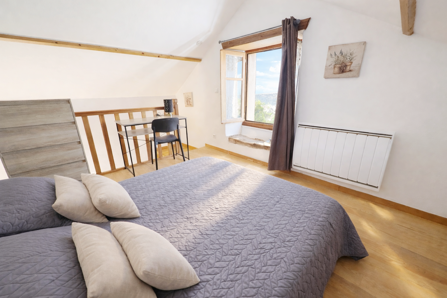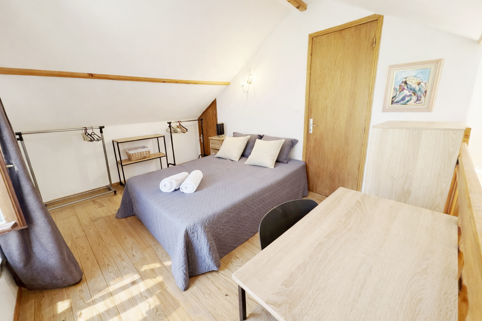 . à l’étage: une chambre (lit, penderie, bureau) et une salle de bains/wc