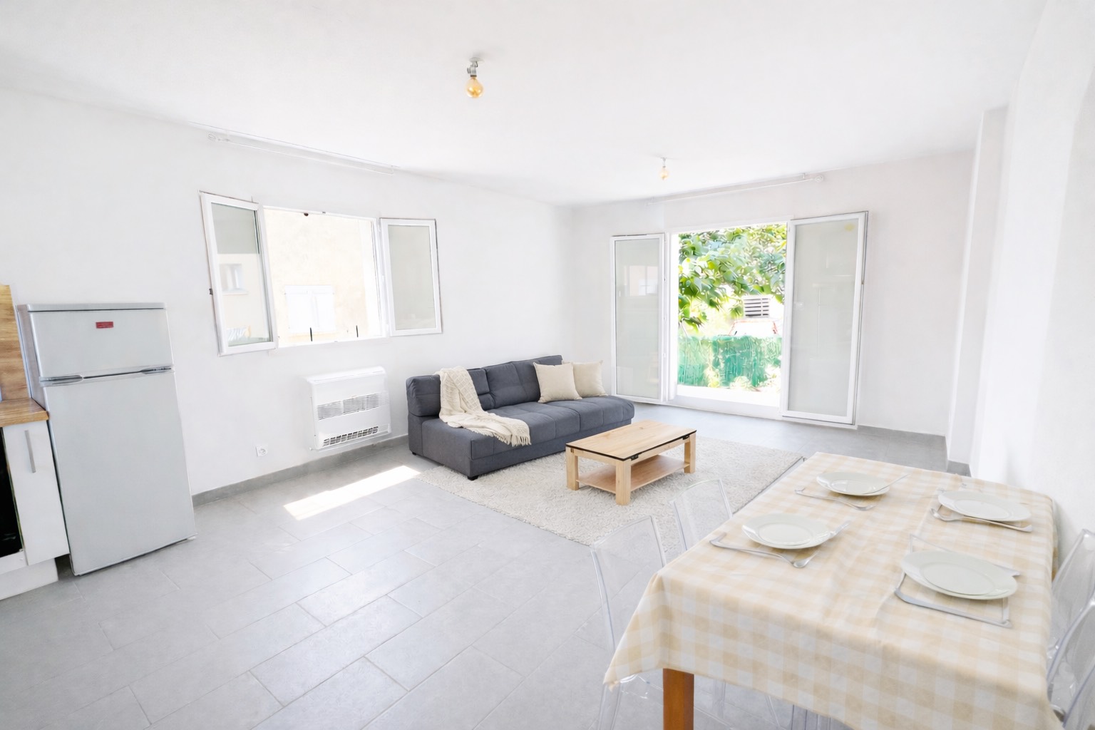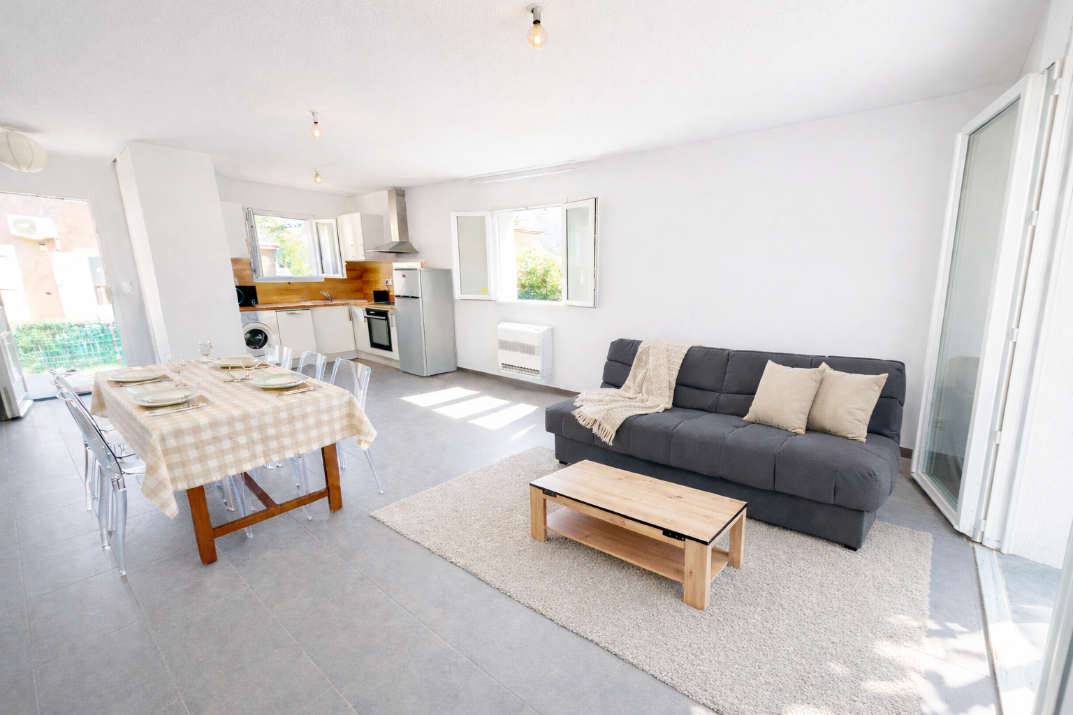 . Un vaste séjour lumineux (avec canapé/convertible, table et chaises, TV…) ouvert sur