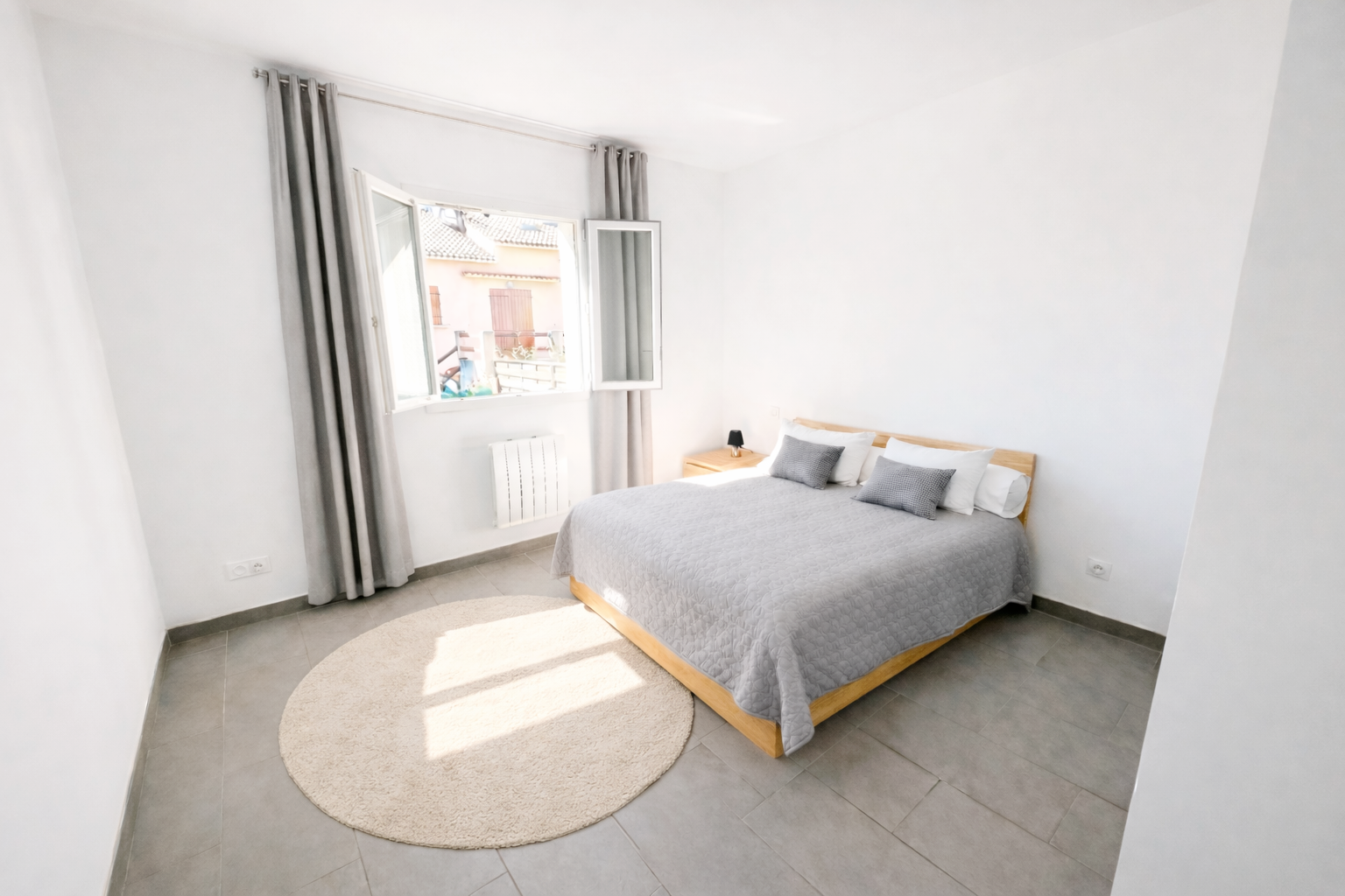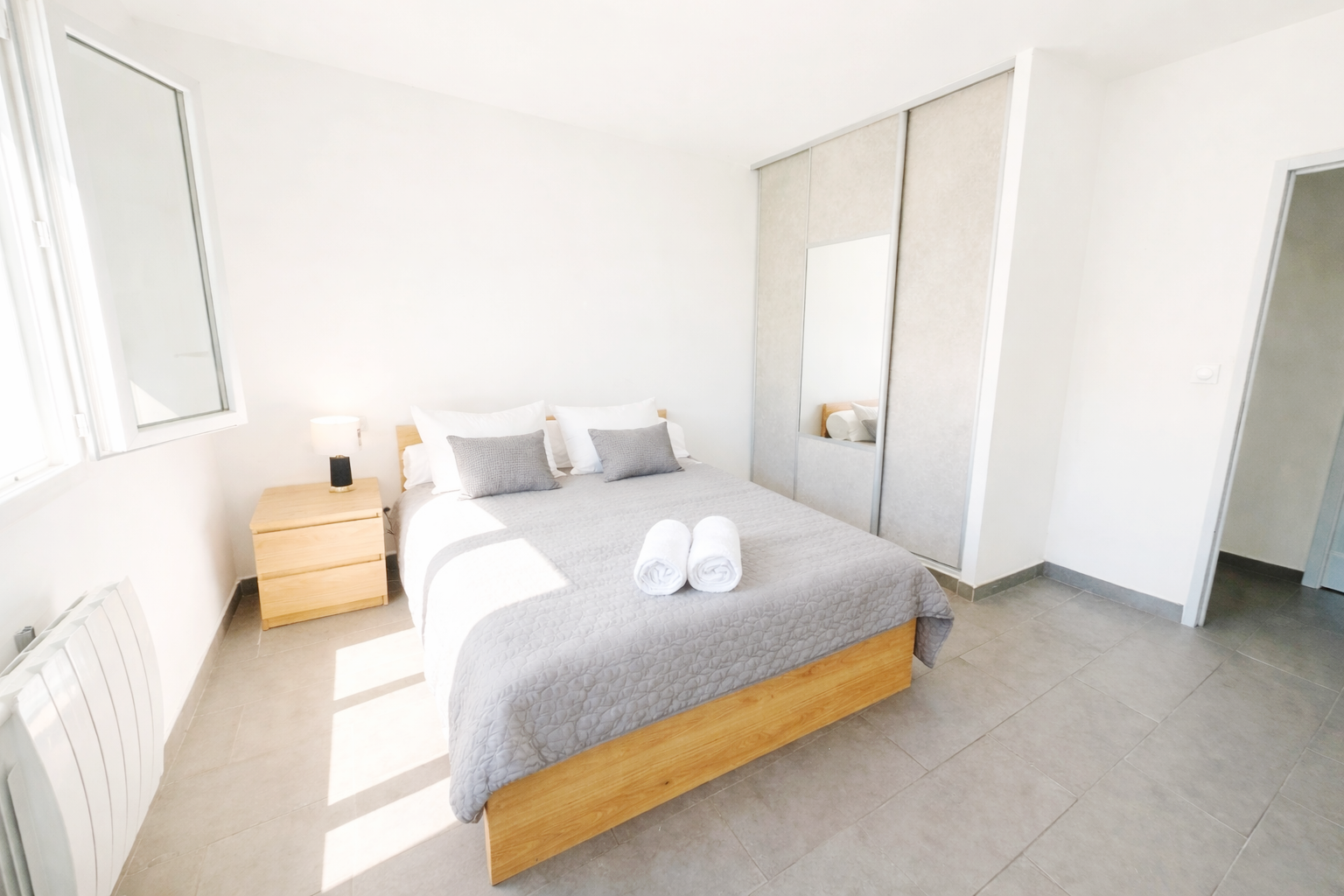 . Une chambre (avec lit 2 places ,grande penderie, table et lampe de chevet)