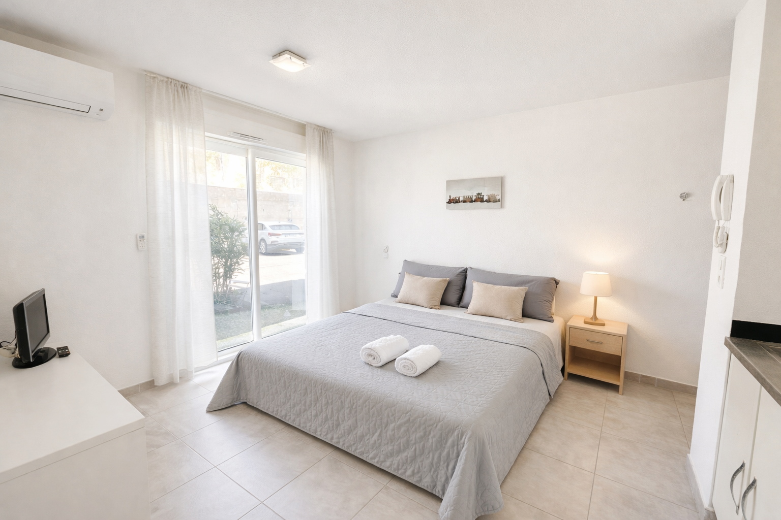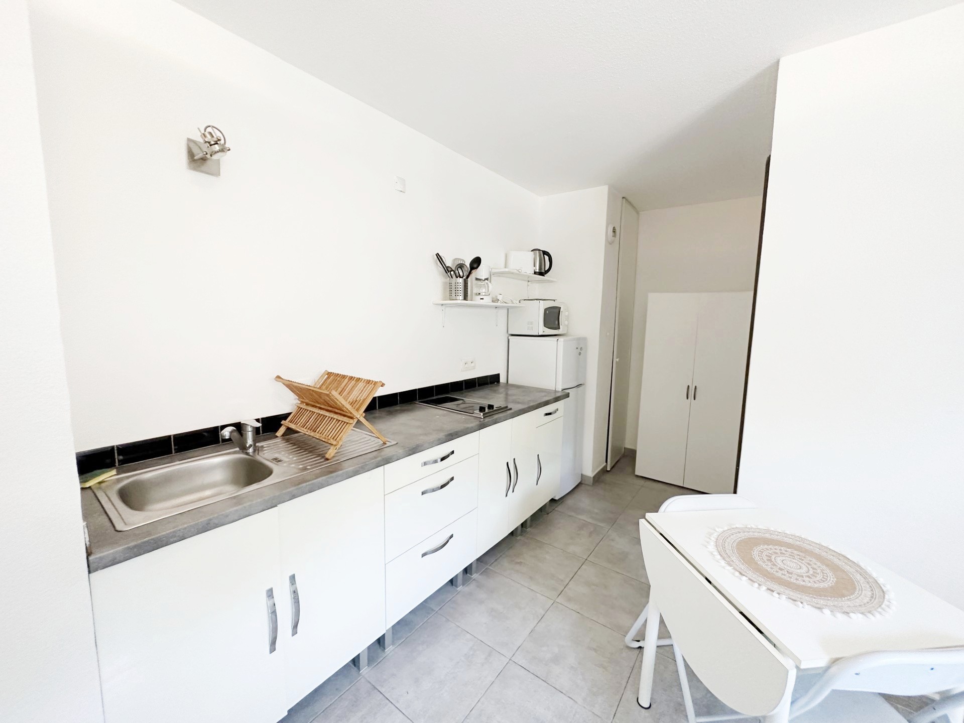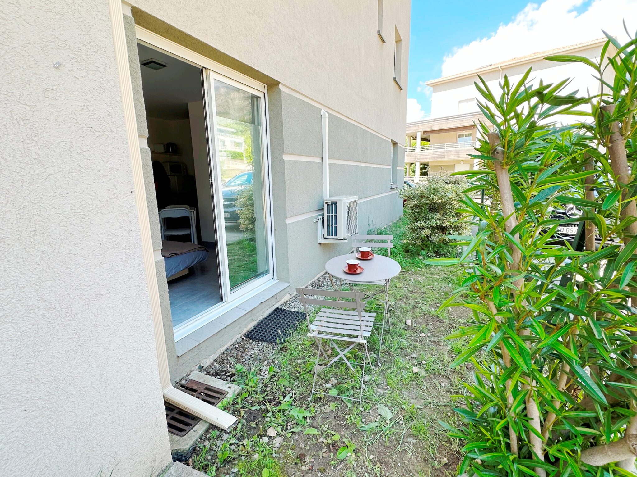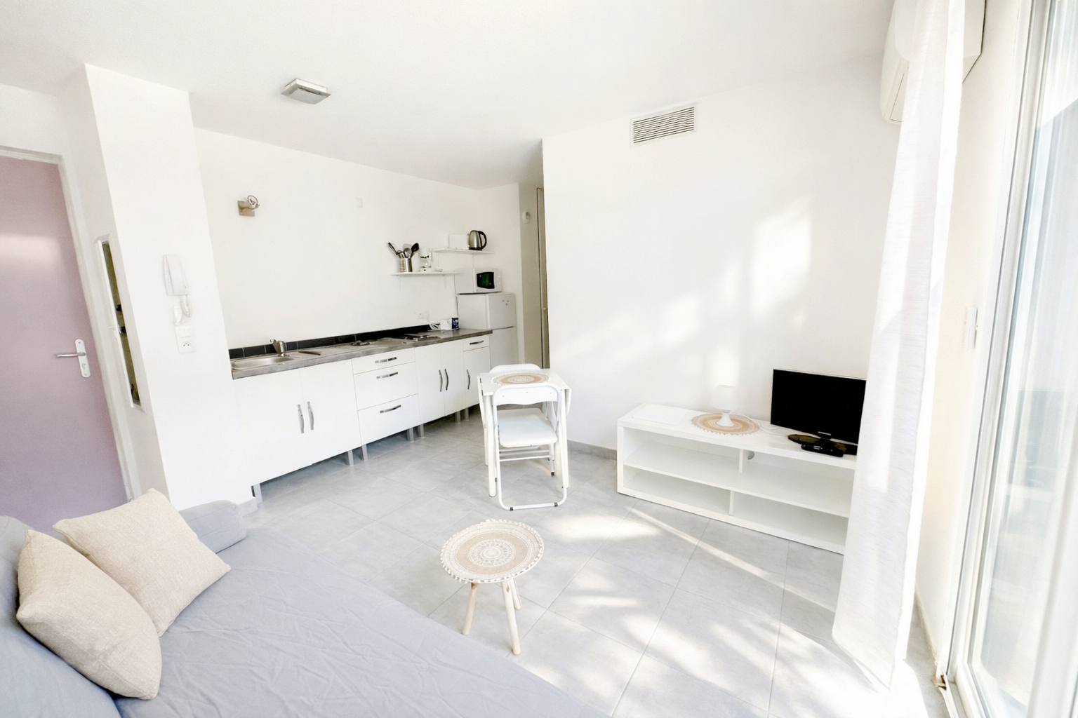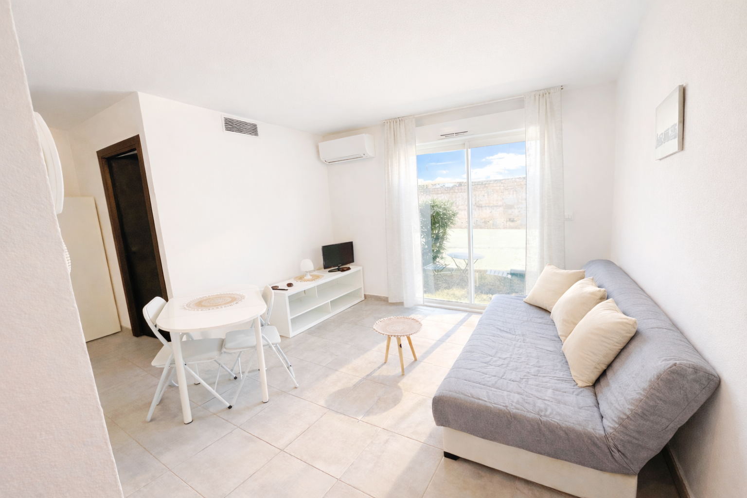 Le studio comprend un séjour/chambre (avec canapé convertible 2 places, table et chaises, table basse, armoire, TV…), un coin cuisine (plan de travail, réfrigérateur avec compartiment congélateur, plaques de cuisson, micro-onde, petit four, cafetière, nécessaire vaisselle…), une salle de bains/wc (avec douche italienne) et un petit espace extérieur (avec table et chaises d’extérieur ) .